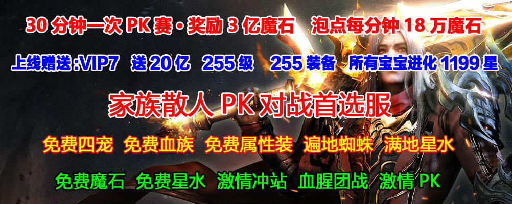 送VIP7、255级、+255战魂+8装备、免费血族、免费4宠、免费打宝地图、上线即送20亿魔石、所有宝宝进化1199星!